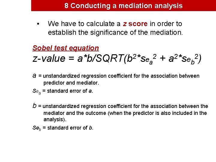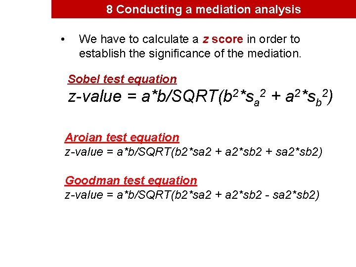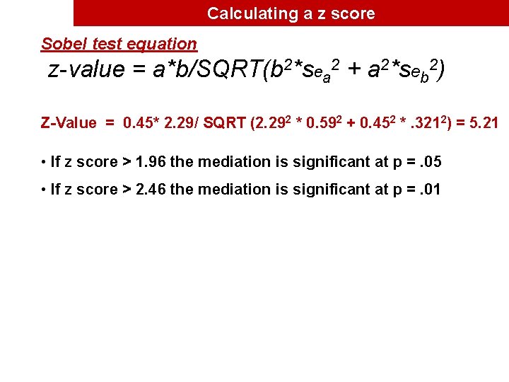 This calculator returns the Sobel test statistic and both one-tailed and two-tailed probability. In order to derive the z-score we need to use the following formula. Sobel Equation A B B 2 S a 2 A 2 S b 2 Aroian Equation A B B 2 S a 2 A 2 S b 2 S a 2 S b 2 Where A Association between IV mediator Coefficient.